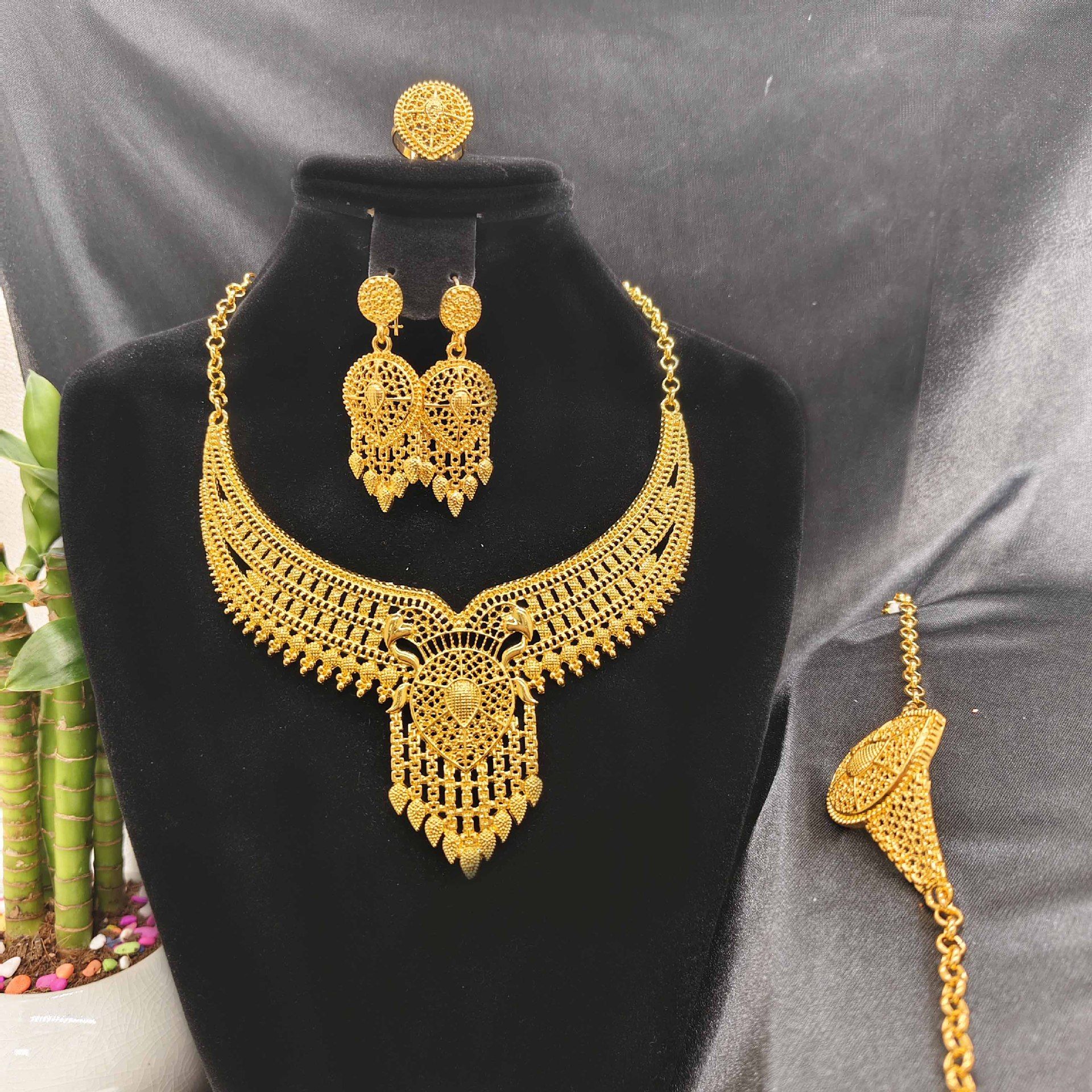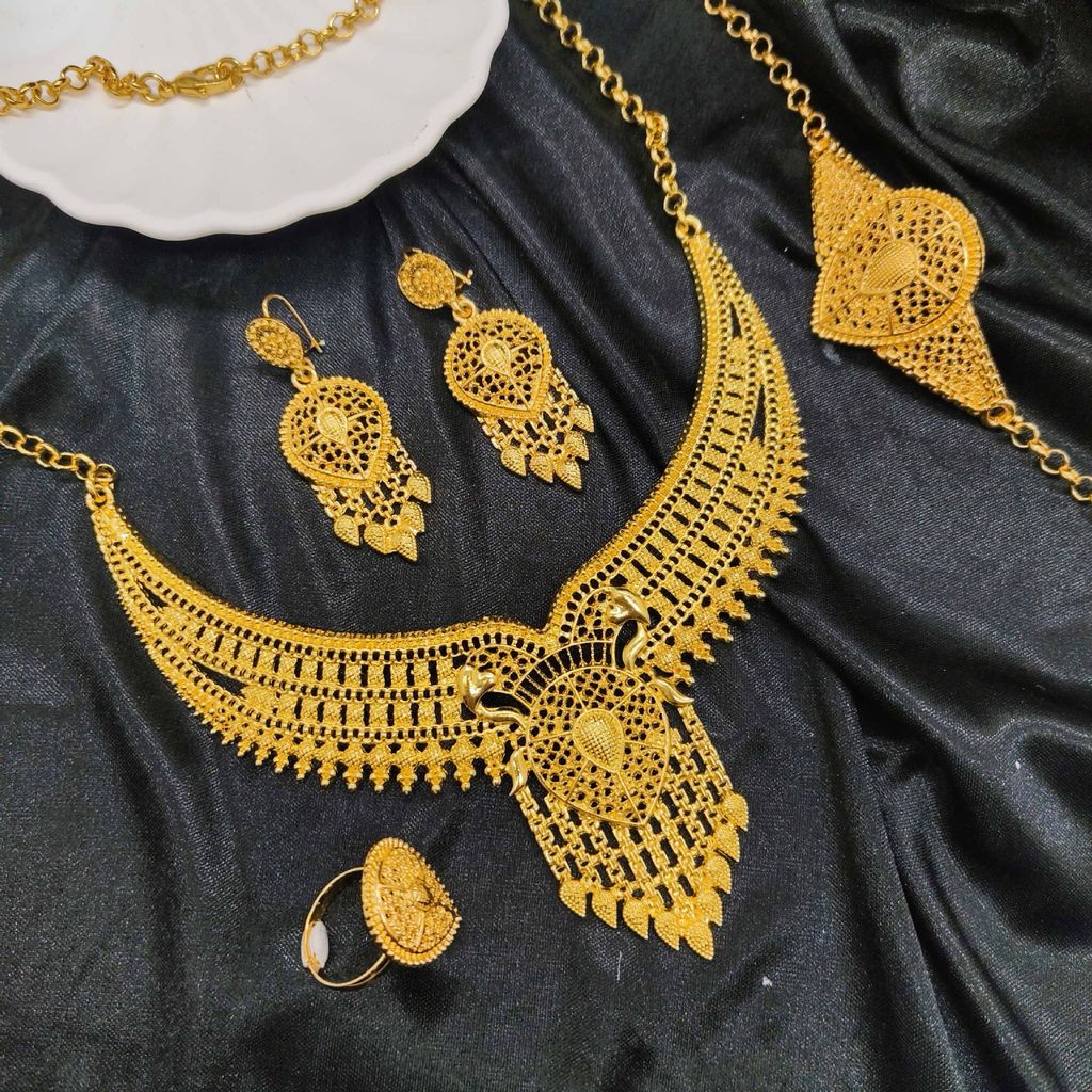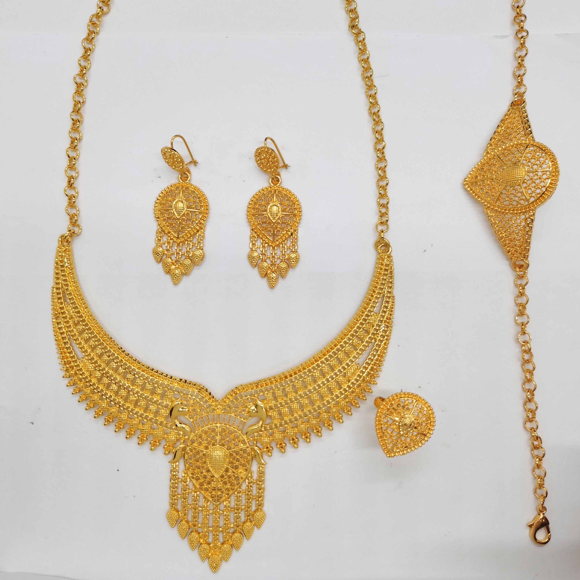 Conjunto 4 peças joias femininas banhado a ouro 24K, pulseira, colar, brincos e anel, estilo luxuoso para mercado da Nigéria